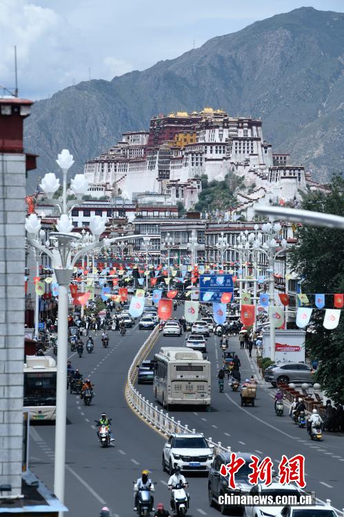 8月7日,随着西藏自治区成立60周年大庆临近,拉萨街头处处洋溢着喜庆氛围。市区主干道的路灯杆上,崭新的国旗与彩旗有序悬挂,鲜艳夺目。人行天桥完成升级改造,装饰板上国旗、石榴籽、牡丹花、浪潮、山川、连心结、雪山与哈达等元素相互交融,别具特色。工作人员正紧锣密鼓地布置花坛,五彩花卉将为城市增添斑斓色彩。此外,各大广场、公园也在装点,准备迎接八方来客。拉萨正以最美姿态,迎接这一重要时刻。图为市区主干道上悬挂的彩旗。