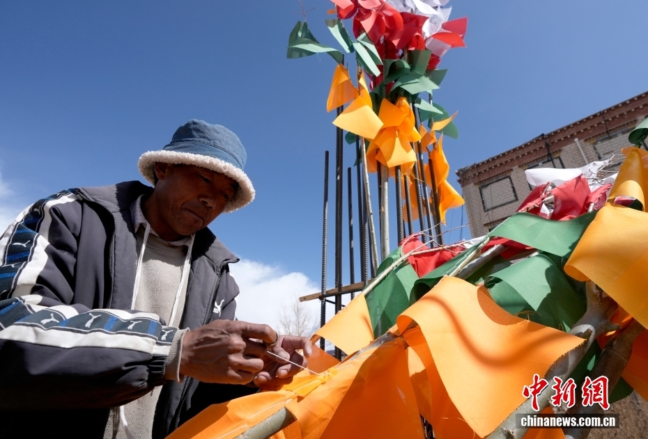 2025年2月22日,随着藏历新年临近,手艺人在西藏拉萨街头缝制经幡树。经幡树是藏历新年民众必备的年货之一,一般有蓝、白、红、绿、黄五种颜色。藏历新年期间,民众会选择一个吉日,为自家的房顶更换经幡树,祈求新的一年里五谷丰登,吉祥如意。