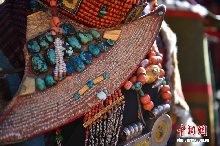 9月23日,西藏自治区阿里地区普兰县,至今保留着独特的藏族服饰——普兰服饰,它是中国国家级非物质文化遗产。普兰服饰已有1000多年的历史,其中最精美、最独特的是妇女的“孔雀服饰”,普兰县科迦村里有7户人家保存着7套祖传服饰,一套重达20多公斤,装饰有黄金、白银、松石、玛瑙、珊瑚、珍珠等,承载和沉淀了百年时光,堪称“穿在身上的千年史”。时至今日,这种美丽的服饰文化还在当地传承着。图为普兰服饰细节展示。