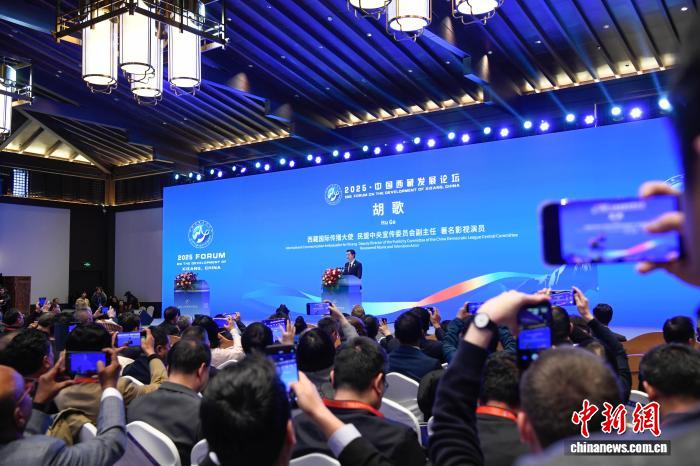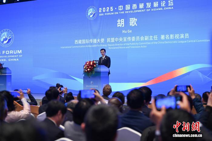 10月29日,“遇见美丽西藏 书写雪域新篇”为主题的2025·中国西藏发展论坛在林芝开幕。来自40多个国家和地区的400多名中外嘉宾参会。图为演员胡歌在开幕式上发言。中新社记者 贡嘎来松 摄