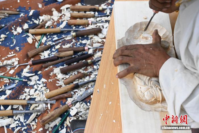 11月23日,第二届“工巧杯”西藏工艺美术中青年高技能人才技艺大赛现场实操技能在拉萨市唐卡艺术博物馆开赛。本次大赛以“薪火相传 守正创新”为主题,由284名选手来自西藏6(市)地的42个县(区),涵盖唐卡、雕塑、编织等36类工艺。据悉,西藏工艺美术行业现有2700余家市场主体、3.7万余名从业者,2024年产值超30亿元(人民币)。图为参赛选手展示木雕作品。中新社记者 贡嘎来松 摄