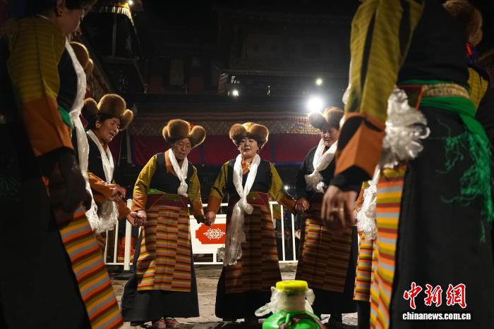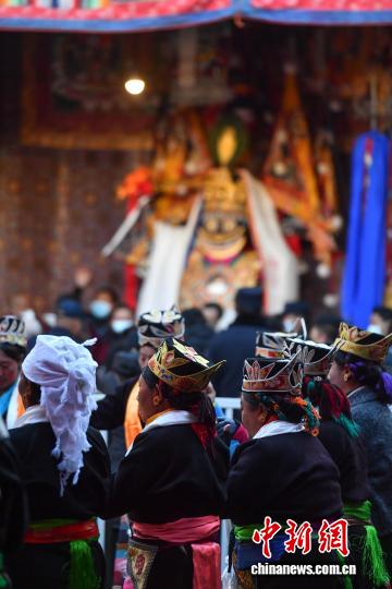 图为信众在大昭寺内唱着吉祥的歌儿,在白拉姆女神像前跳起锅庄,欢庆“仙女节。贡确 摄
