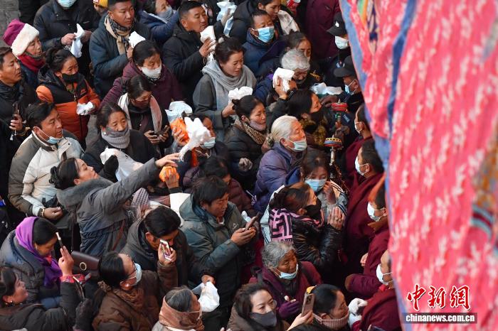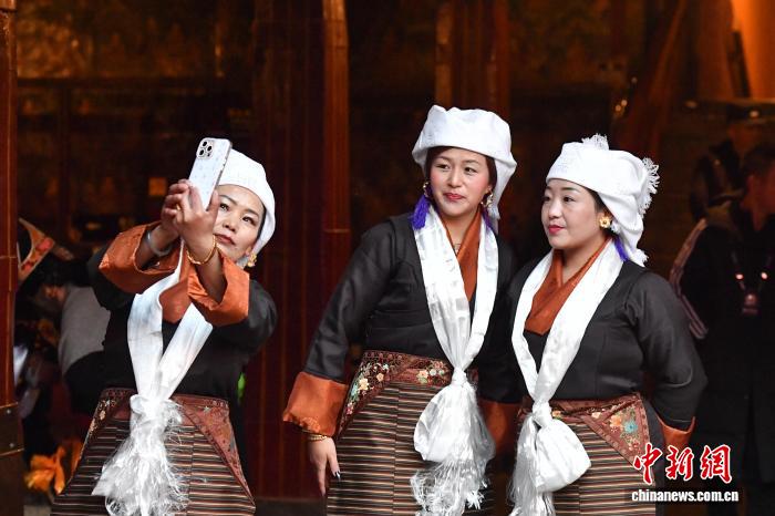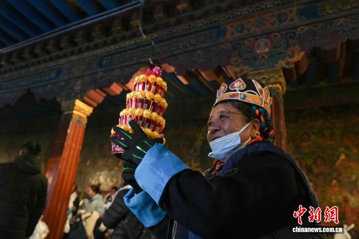 12月4日,藏历十月十五日,这一天是西藏的传统民俗节日“白拉姆节”,也被称为“仙女节”。当天信众们穿着节日盛装,手捧哈达、鲜花、水果、青稞酒等供品前往大昭寺,面对寺内的白拉姆和赤尊赞神像,双手合十虔诚地祈福并敬献供品,祈愿来年丰收、无灾无病。相传,白拉姆是拉萨地区的保护神,是藏传佛教最高护法神之一班丹拉姆的女儿。白拉姆曾与大昭寺护法神赤尊赞相互爱慕并私定终身,其母亲班丹拉姆发现后,赤尊赞被赶到拉萨河南岸,每逢藏历十月十五日,二人才能隔河相见一次。图为信众手捧哈达、青稞酒,在大昭寺内欢庆“仙女节”。贡确 摄