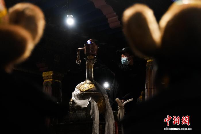 图为大昭寺内,白拉姆女神像对面的“马头酒坛”,信众为白拉姆供奉青稞酒。贡确 摄