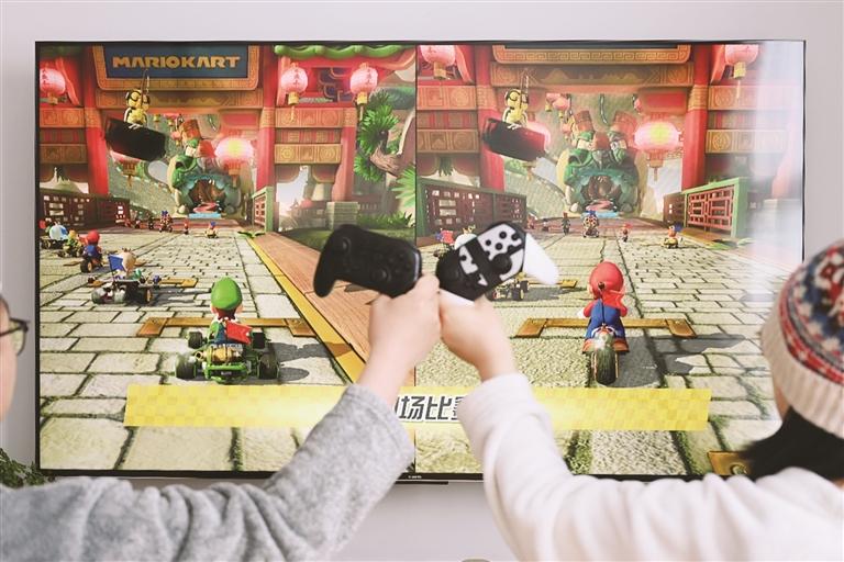 拉萨市民在家中体验任天堂经典游戏《马里奥赛车》。