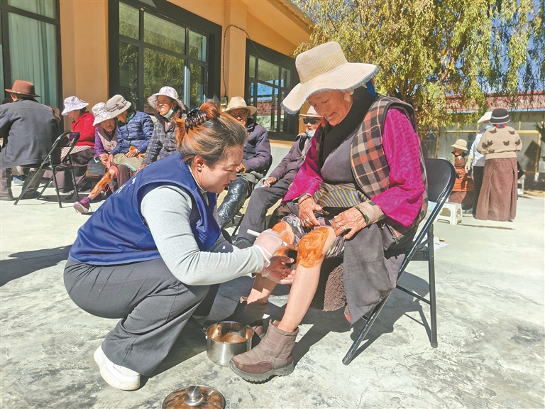 图为工作人员为老人提供藏式理疗服务。图/文 记者 央金