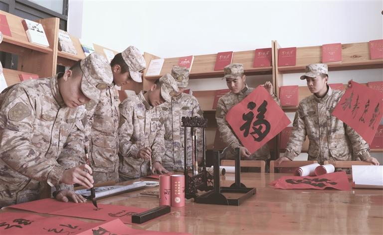 图为官兵们在写春联。通讯员 沈勋付 摄