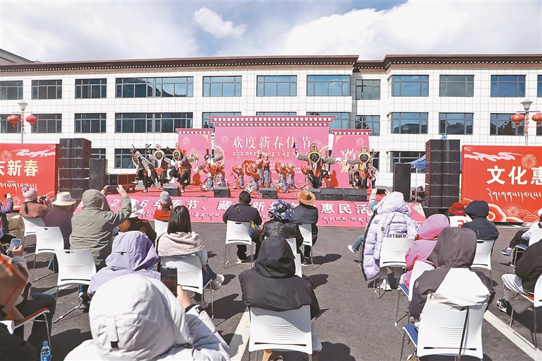 随后,在社区剧场内,雅砻扎西雪巴藏戏精彩上演。演员们头戴面具、身着华丽戏服,以高亢嘹亮的唱腔和富有张力的动作,演绎着古老传说。舞台下,游客们或举起手机记录精彩瞬间,或随着节奏轻轻拍手,沉浸在这场独具藏式风情的“村晚”之中,剧场里洋溢着欢乐祥和的节日氛围。