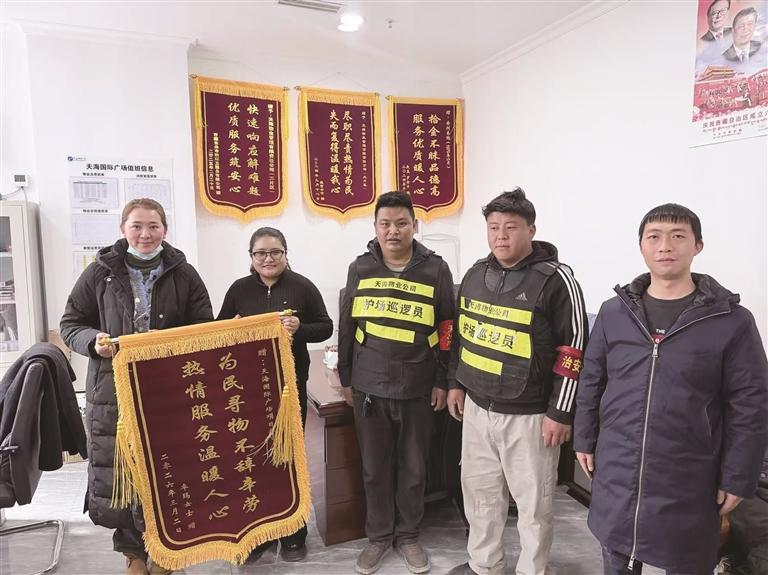 故事回溯至3月2日下午,三位市民途经天海国际广场停车场出入口时,发现地面上遗落着一个黑色手提袋。他们在路边等候了几分钟,仍未见有人前来认领,便将手提袋交给了正在附近巡逻的保安,保安迅速将情况上报给项目部负责人次仁卓玛。次仁卓玛与同事一起查看袋内物品,发现里面整齐码放着一沓沓现金和几件衣物。经过仔细清点,现金总额达六万元。“看到这么多现金时都吃了一惊,心想失主肯定急坏了。”次仁卓玛说,随后根据天海物业公司领导指示,大家一边调取停车场及周边的监控录像寻找失主,一边向公安机关进行了报案。