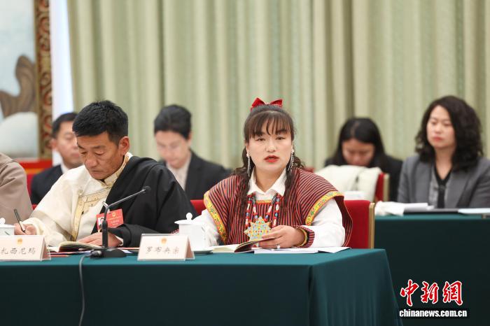 3月6日,全国人大代表罗布央宗(前排右一)身着门巴族服饰,出席十四届全国人大四次会议西藏代表团开放团组会议。中新社记者 杨郁然 摄
