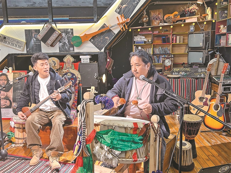 图为旦增益西(左)使用新一代扎念琴进行弹唱。记者 晓勇 罗宗 摄