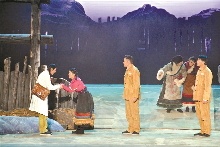 舞台上,5名随十八军进藏的知识青年,在险象环生的进藏路上结下了深厚的革命情谊,并组成“五星小队”。他们发挥各自所长,背着药箱翻山越岭为藏族群众治病,在帐篷里办起小学,在草原上建起兽医站……一个个真实鲜活的场景,织就了一幅跨越数十年的历史长卷,谱写了一曲老西藏精神的赞歌。