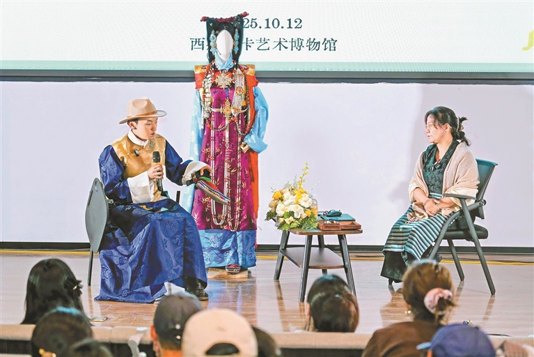 2025年10月,在西藏唐卡艺术博物馆,班珠丹塔(左)与中国藏学研究中心的研究员次仁央宗合作主讲《霓裳藏韵:卫藏古典服饰里的文化、礼制与时代流变》。