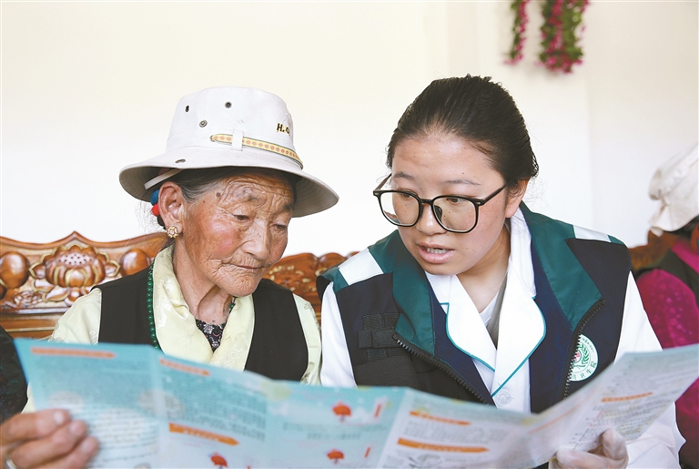 墨竹工卡县工卡镇卫生院医护人员上门为老人提供健康咨询和专业康养指导服务。
