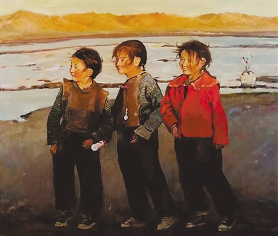 这幅画源自多年前张鹰老师在西藏下乡时看到的真实场景:初春的高原,河流尚未解冻,可几个小姑娘却穿着稍显单薄的衣衫,跑到村庄附近的河边玩耍,有点冷的风吹乱了她们的头发,阳光却打在她们真挚好奇的脸上……张鹰老师被这个场景触动,便当场用相机拍了下来,很多年后,当他看到这张旧照片时,又想起当年的情景,于是便画了出来。