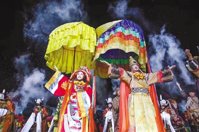 星空为幕,山川为景,气势恢宏,震撼心灵。直抵人心的音乐声响起,欢快的果卓鼓声震天,热情的篝火升腾!打阿嘎的遁地之声、古老藏戏的委婉传唱、甲谐的豪情奔放……恢弘的布达拉宫布景前,“文成公主”和“松赞干布”穿越千年而来,再现汉藏和美的动人传奇。