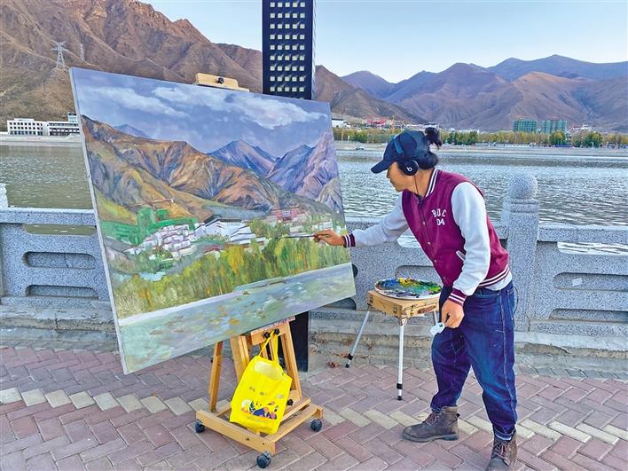 仝海明在拉萨河畔写生。