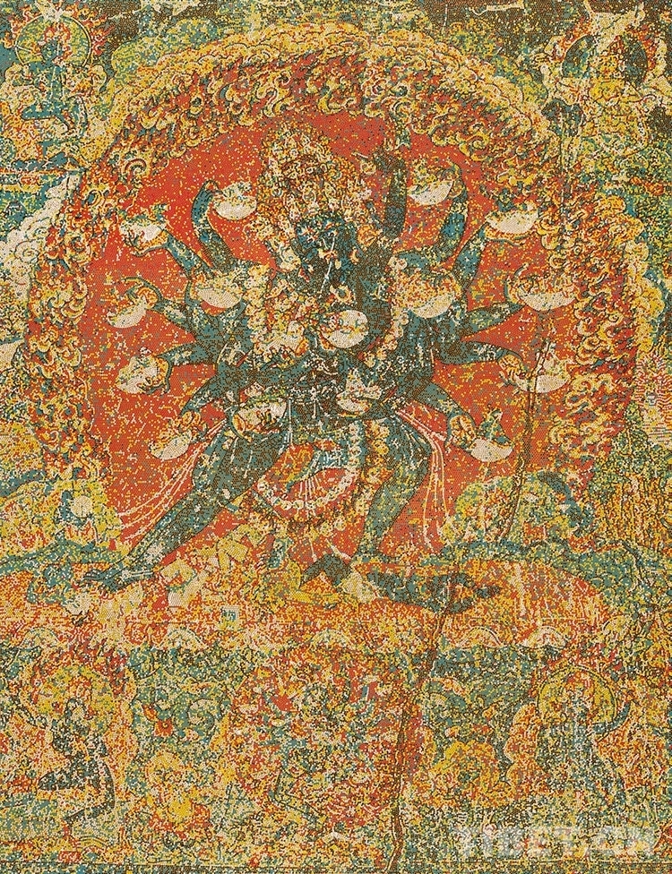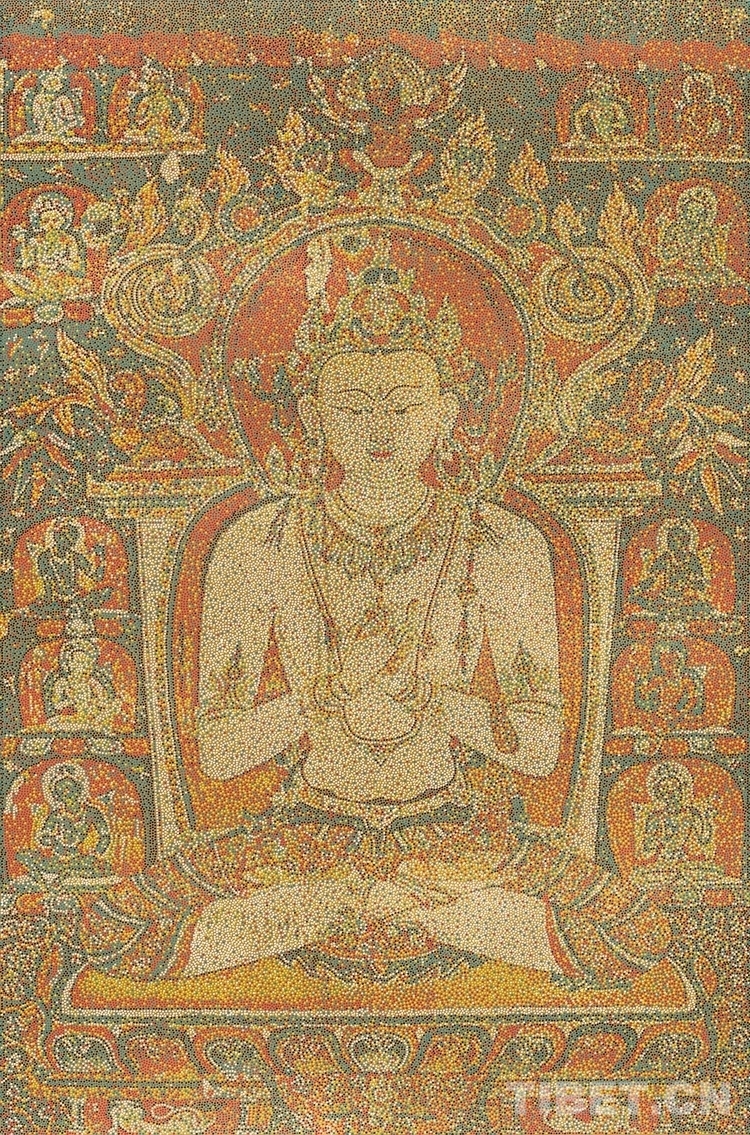 从11世纪扎塘寺“佛说法图” 开始,观众将一路遍览夏鲁寺“五方佛”(14世纪)、白居寺“绿度母”(15世纪),贡嘎曲德寺“喜金刚”(15世纪)、古格故城“南方宝生佛及众菩萨”(16世纪)等经典图像,经过罗布林卡格桑颇章的“白度母”(18 世纪),最终抵达展览场所本体——吉崩岗拉康中的“莲花生大师”(19世纪)。杨冕用“CMYK”的创作方式,串起一条简明的西藏壁画源流线索,也邀请观众以“民主性”的观看重新解读经典图像。