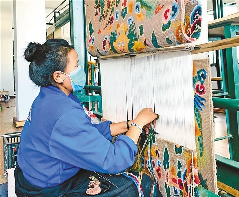 在江孜县年堆乡尼玛藏式卡垫加工农民专业合作社生产车间,工人在用传统工艺编织藏毯。记者 袁海霞 摄