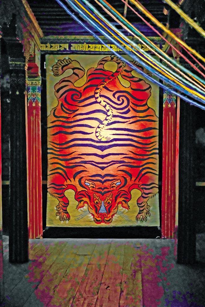 说起老虎,生活在不同地区的中华民族先民们都不约而同地对其有着崇拜和描绘。根据相关文献记载,早在5000年前,阿里地区的居住者就将虎皮纹饰等符号刻在岩石上;公元7世纪前后,松赞干布曾颁布《三十六制》,提到“虎皮褂、虎皮裙、虎皮袍”等称为“六勇饰”,只有具有相当地位和成就的人才能佩戴,虎的图案也自此融入地毯等西藏织物中。