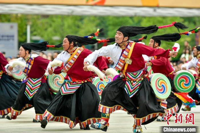 西藏自治区山南市琼结县代表队展示《琼结久河卓舞》。琼结久河卓舞,亦被称为西藏的“腰鼓舞”,是流传于西藏自治区琼结县下水乡久和村的传统舞蹈,为国家级非物质文化遗产代表性项目。琼结久河卓舞起源于公元8世纪,至今已有1300余年的历史。记者 刘忠俊 摄