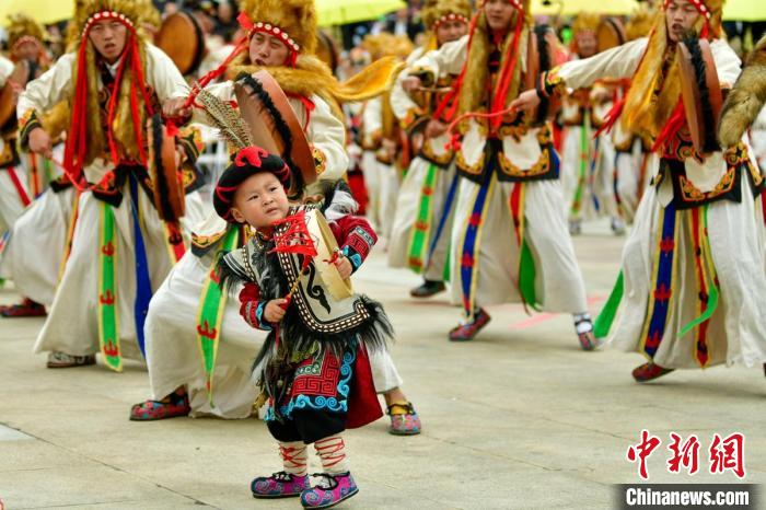 《羌族羊皮鼓舞》展演现场。羌族羊皮鼓舞羌语称“莫恩纳莎”或“布滋拉”,主要流传于四川省阿坝藏族羌族自治州汶川县、理县一带,为国家级非物质文化遗产代表性项目,也是联合国教科文组织人类非物质文化遗产代表作“羌年”的主要实践项目。记者 刘忠俊 摄