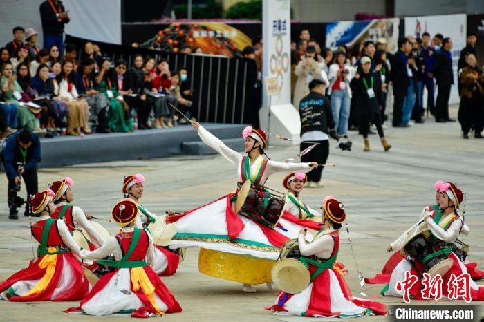 吉林省延边朝鲜族自治州汪清县代表队展示《中国朝鲜族农乐舞》。中国朝鲜族农乐舞,是融音乐、舞蹈、戏剧为一体的传统文化艺术形式,其扎根于东北朝鲜族聚居地区,以吉林省延边朝鲜族自治州流传最为广泛,于2009年被列入联合国教科文组织人类非物质文化遗产代表作。记者 刘忠俊 摄