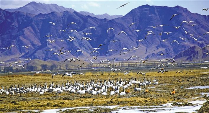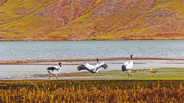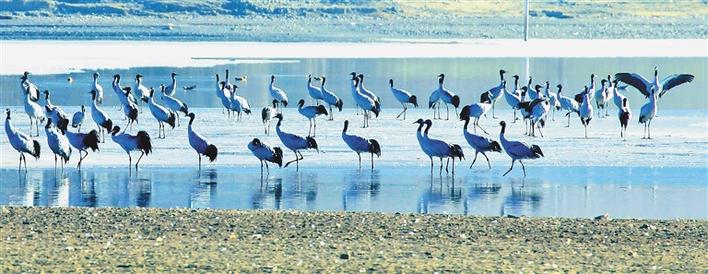在冬日暖阳的照耀下,成群结队的鸟儿在河面上、湿地里尽情嬉戏,赤麻鸭悠然戏水、斑头雁低声吟唱、黑颈鹤翩翩起舞……一派热闹的景象。