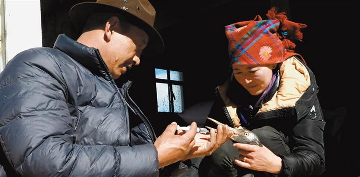 “你看,这只黑颈鹤是十几天前我从田间救回来的,当时它的翅膀和右腿都受了伤,奄奄一息,我还担心救不活它。我把消炎药放入酥油中搅拌制成膏药,涂抹在它的伤口上,并给它喂了口服消炎药,白天就把它放到院子里,让它锻炼受伤的腿脚。通过细心照料它恢复得很好,等它痊愈了,我就把它放归大自然。”49岁的巡护员多布杰高兴地说。