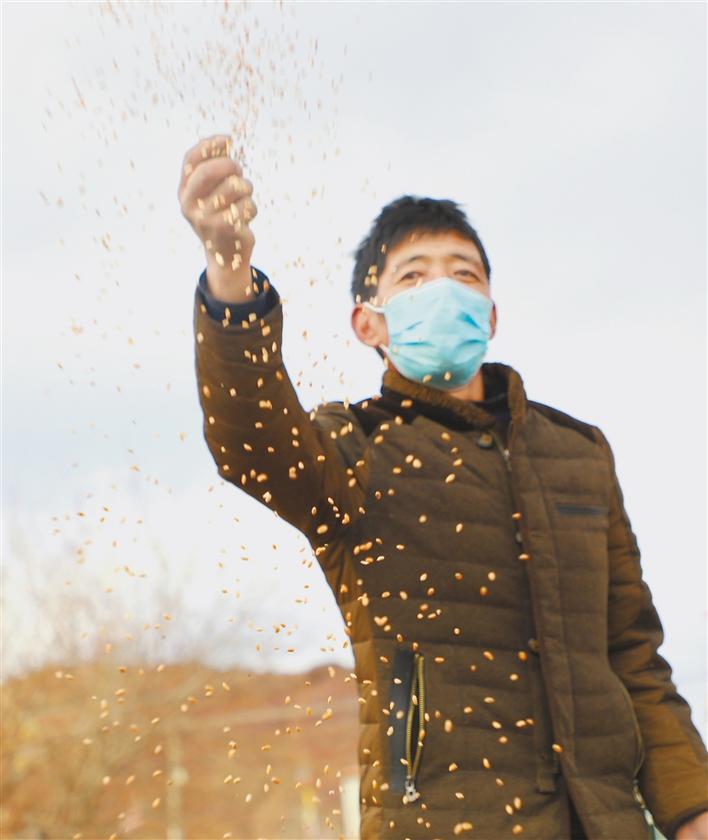 巡护员多布杰为栖息在林周县境内的候鸟投食。