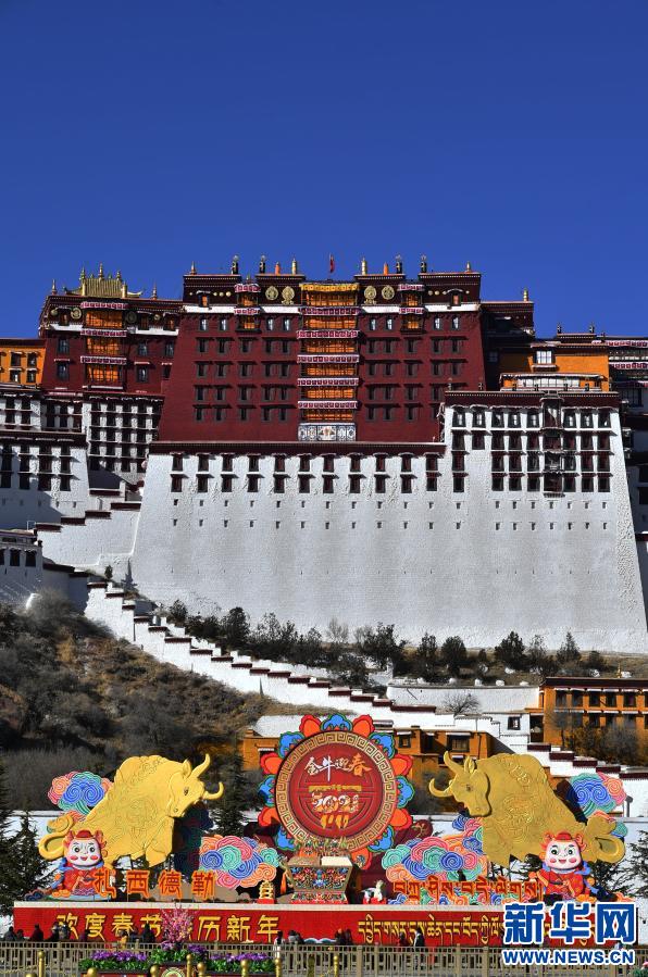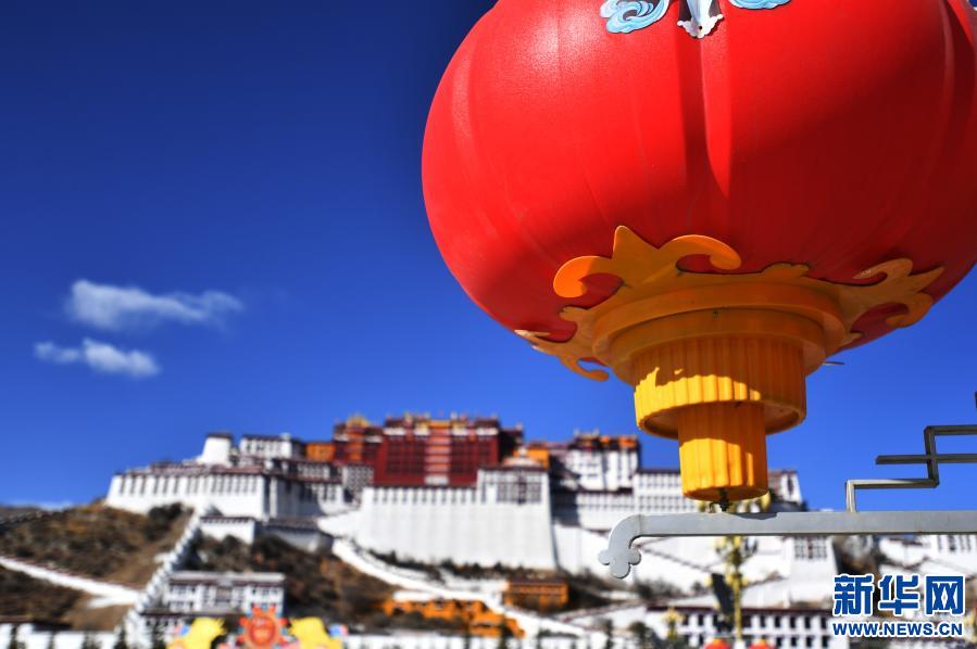 2月8日拍摄的布达拉宫前迎接春节和藏历新年的吉祥装饰。新华社记者 觉果 摄