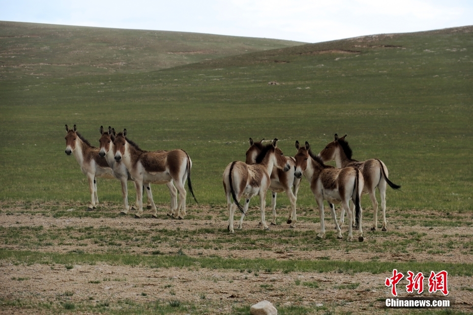 7月25日,青藏高原湖泊拉果错岸边野驴成群。拉果错位于西藏阿里地区改则县麻米乡行勤村,生态环境良好。 中新社记者 孙自法 摄