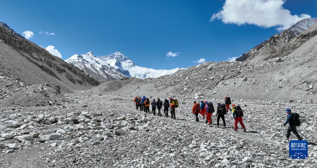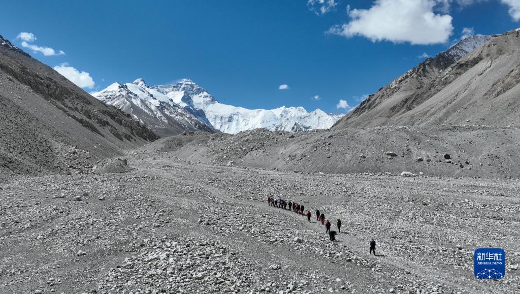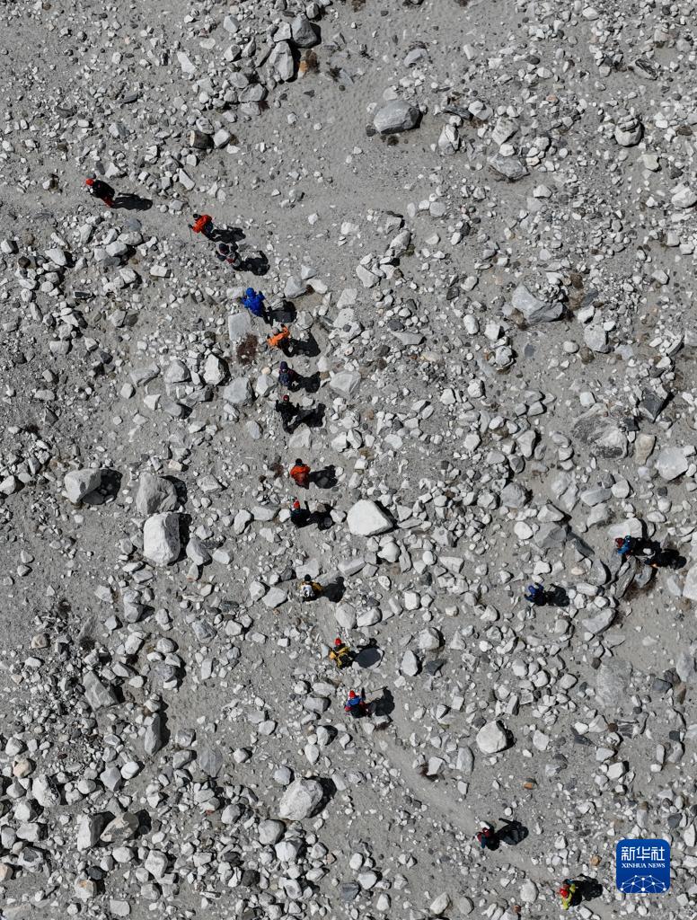 5月18日,登山队从珠峰大本营出发(无人机照片)。新华社记者 晋美多吉 摄