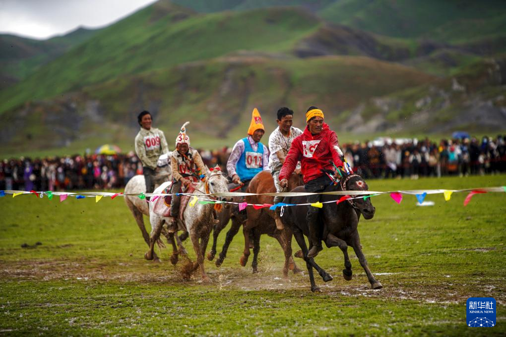 在赛马比赛现场,吉祥的“切玛盒”里装满了炒麦粒和糌粑,银碗缀着酥油、盛满青稞酒。赛场边有身穿邦典(藏族色条围裙)的妇女带着孩子围观,有扎起长辫、头戴毡帽的老人远眺,还有小孩兴奋地指着远处飞驰的马匹……冒雨而来的上千观众随着场上赛马冲刺发出热烈的欢呼。