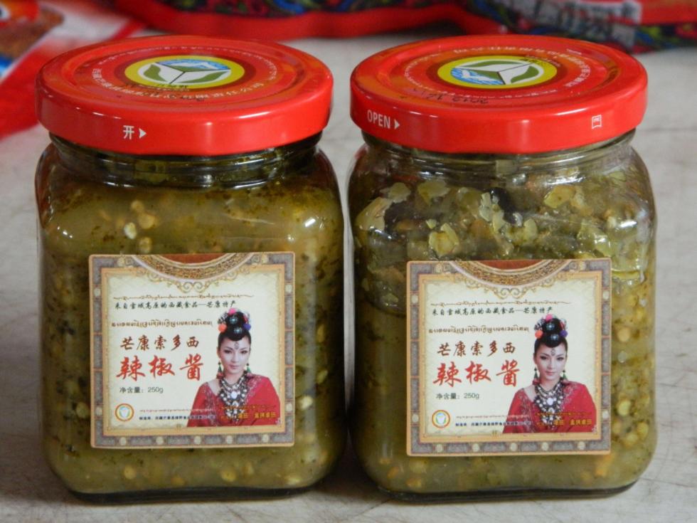 首先要介绍的是索多西辣椒酱,其产地范围为西藏自治区昌都市芒康县索多西乡、朱巴龙乡、如美镇、纳西乡、曲孜卡乡、木许乡共6个乡镇现辖行政区域。这里的群众世代种植辣椒,当地气候干热,土质肥沃,特别适宜辣椒生长,出产的辣椒皮薄、肉厚、色泽口感俱佳。
