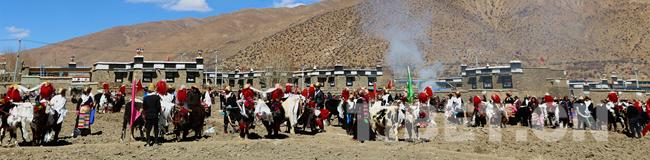 上午10时许,村里的男女老少穿上节日盛装,从村子的各个角落来到村南头一块叫作“当嘉”的肥沃土地上。男人们牵着装饰好的耕牛,或扛着铁犁;家庭主妇们把春耕欢庆时用的青稞酒、卡赛(用酥油、菜油、猪油等炸成的多种面食)、切玛等放到供桌上摆着,小孩子们在田间喧闹戏耍,一片喜气洋洋的景象。