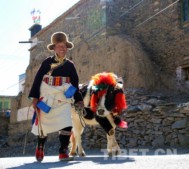 旺堆,坚耶村村民,60岁的老人早晨7点就起床,把自家耕牛装扮得花枝招展,迎接一年一度的春耕节仪式。“我这把年纪了,但每到春耕节首先准备的就是传统的农耕具,因为我们不能丢了老祖宗留下来的传统文化吧!”旺堆老人还指着耕牛的铃铛说:“去年物交会上买的,漂亮吧?声音清脆又响亮。”