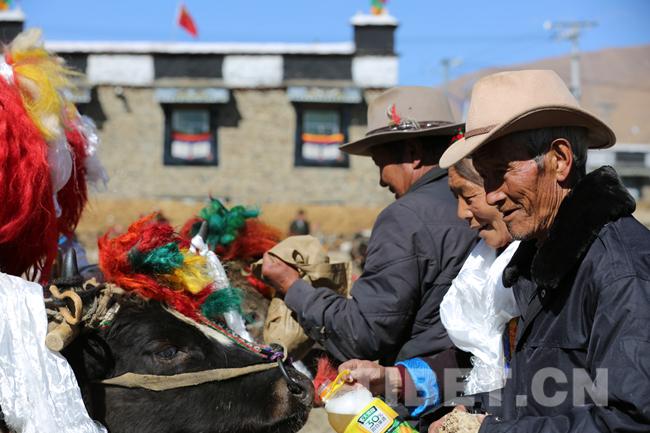 图为坚耶村民给耕牛灌青稞酒。