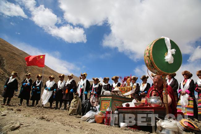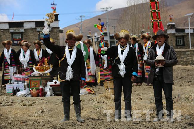 春耕仪式结束时,一名德高望重的当地僧人,左手捧香壶,右手端盛有青稞酒的酒杯,口诵经文,将酒洒向三界。随后,与今年属相相符的三个男人手中分别拿着“达达”(宗教用品)、羊腿、装满糌粑和酥油的“塔罢(铜质碟子),随着法号的奏鸣,东、南、西、北四个方向分别喊:
