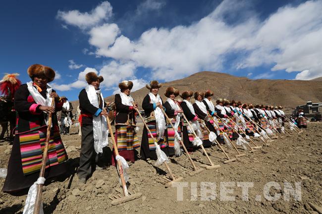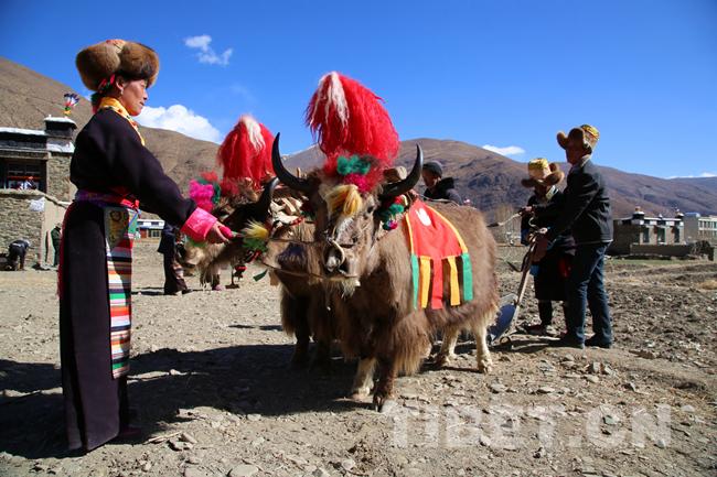 11点整,寂静的村庄突然响起此起彼伏的欢呼声,洁白的哈达在每头耕牛角上飘起,鲜艳的五星红旗在田间地头随风飘扬。随着两头披红挂彩的健壮犏牛犁开第一块地,春耕仪式正式开始。新耕的第一犁,由一个属相与当年属相相符的妇女撒出吉祥、幸运的种子,其余的耕牛一对跟着一对地翻耕。此时的田地里,是人与牛同乐的世界。