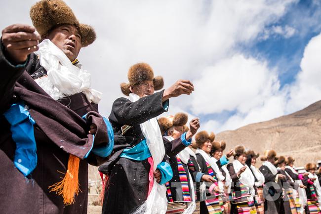 图为坚耶村春耕仪式现场,村民们向天空抛撒糌粑,祈愿风调雨顺,庄稼丰收。