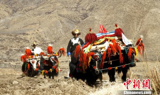 在春耕仪式上,民众把一条条洁白的哈达献给开“第一犁”的青年男女、耕牛,以及盛满青稞良种的器具,同时在桑烟缭绕的农田里载歌载舞,祈愿来年丰收、风调雨顺。
