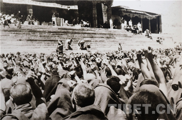 图为拉萨哲蚌寺翻身贫苦僧人控诉寺院农奴主压迫罪行