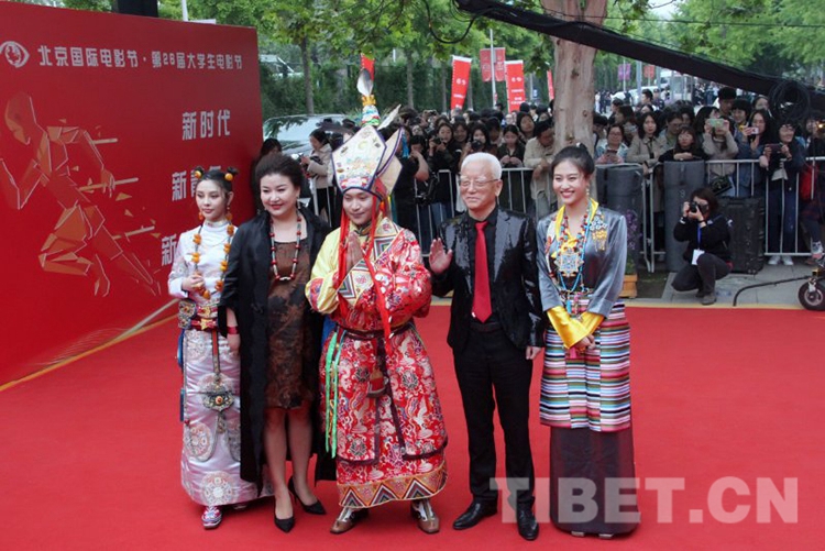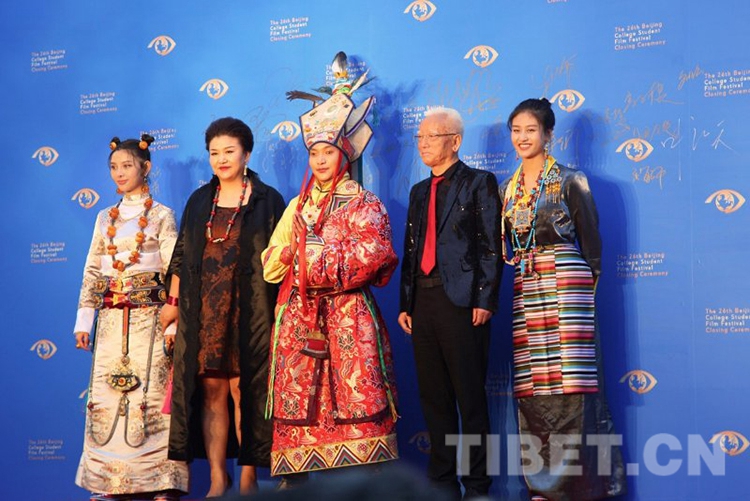 图为电影《英雄格萨尔》主创团队亮相第二十六届北京大学生电影节闭幕式。摄影:尹超