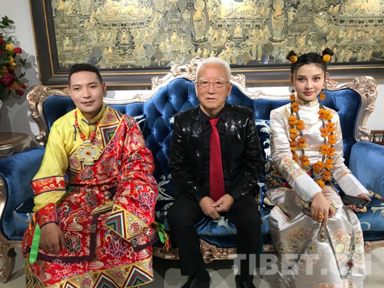 图为《格萨尔》史诗说唱艺人斯塔多吉和《英雄格萨尔》原著作者降边嘉措以及藏族青年女演员合影(从左至右)。摄影:尹超