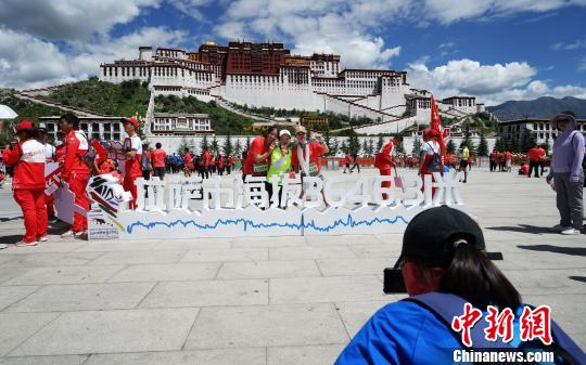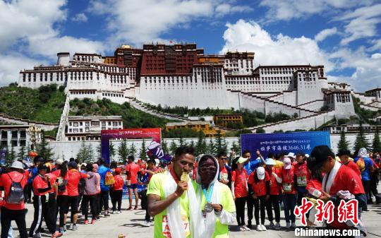 8月18日,2019拉萨半程马拉松在西藏拉萨落下帷幕,来自全国各地的5000名跑者在奔跑中感受西藏民主改革60年后新拉萨的热情与活力。图为参赛选手在布达拉宫前拍照留念。 张伟 摄