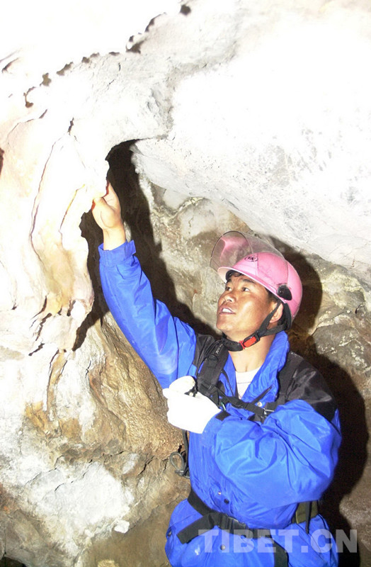 这是西藏藏医学院教师格桑顿珠在班戈县保吉乡娘日贡溶洞考察中,发现了可入藏药的海水石(唐召明2001年摄)