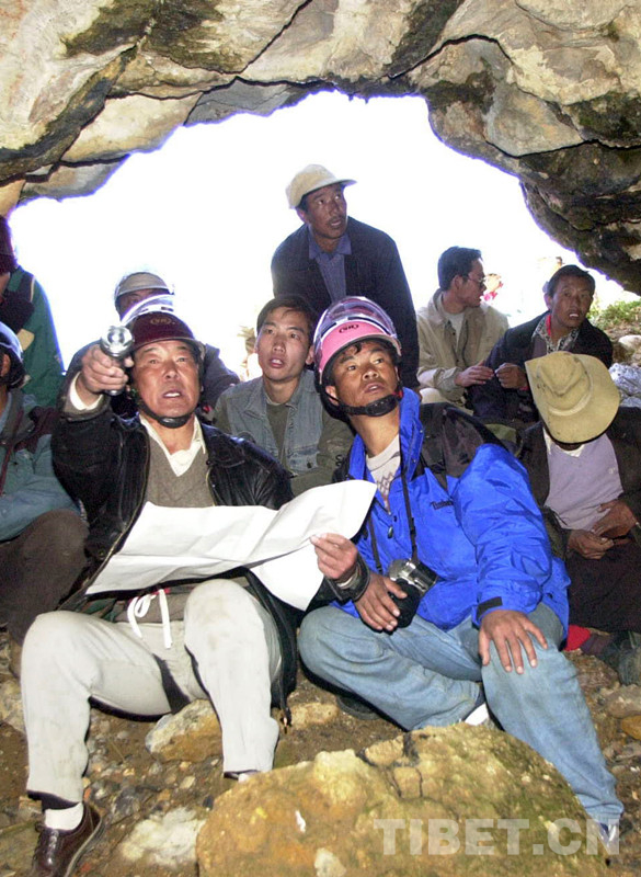 这是西藏藏医学院教师格桑顿珠(前右)在班戈县保吉乡娘日贡溶洞考察(唐召明2001年摄)