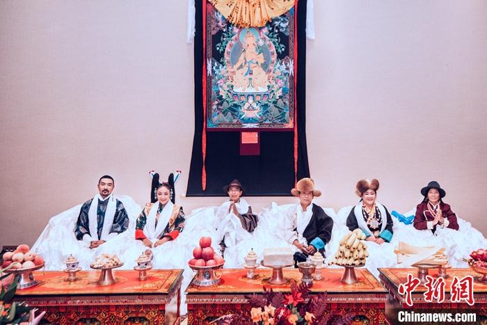 资料图为德吉卓玛(左二)和先生德格叶(左一)在婚礼上的照片。中新社发 德吉卓玛供图