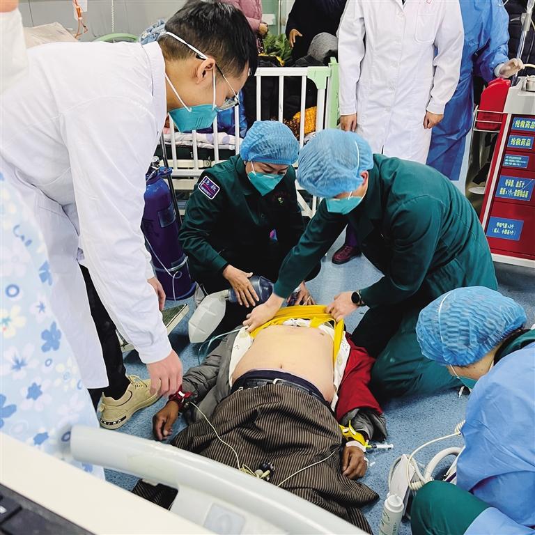 急诊科值班医生陈胜、副护士长赵文熠等立即携抢救车、除颤仪赶赴现场,此时,冬某意识丧失、颈动脉搏动消失、呼吸极其微弱。见患者病情危及生命,医护人员立即实施抢救工作。急诊医护团队配合默契,胸外心脏按压、球囊辅助通气、建立静脉通道、静推肾上腺素、查心电图、监测生命体征、吸痰……一切有条不紊地进行着。随后,心电图提示室颤,医护人员立即予以非同步200J电除颤1次,待转运床到位后立即转运患者至抢救室进一步救治,转运过程中心肺复苏不间断。